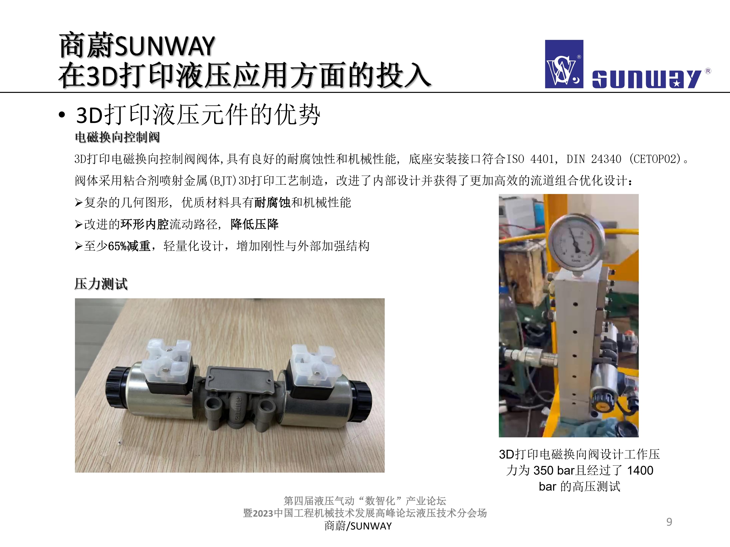 在刚刚落幕的第四届液压气动“数智化”产业论坛上,上海商蔚机械科技有限公司(商蔚 SUNWAY)总经理陆林海先生发表主题演讲,率先在国内宣布将金属3D打印技术成功应用于高性能液压阀的批量制造,标志着中国液压企业在高端制造领域实现关键突破。